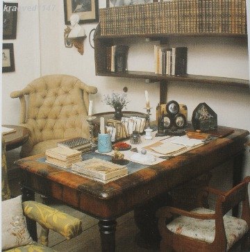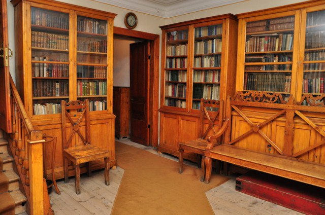 Далее находится кабинет писателя. Главный предмет здесь – старинный письменный стол из персидского ореха, оклеенный зеленым сукном. Он принадлежал еще отцу писателя. За этим столом создавались романы, прославившие его на весь мир: “Анна Каренина” и “Война и мир”. На столе расположены портреты трех братьев Толстого, глыба зеленого стекла, которую подарили рабочие в знак поддержки после отлучения от церкви, и бронзовое пресс-папье в виде собачки, которое писатель упомянул в “Воскресении”. В качестве стула ему служило детское кресло его дочери Татьяны: он вынужден был работать на низких стульях из-за плохого зрения. В кабинете у стены стоит старинный диван, на котором появился на свет Лев Николаевич, его братья и сестра, а позже и его одиннадцать детей. Диван описан в “Войне и мире”: именно на нем рожала маленькая княгиня Болконская. На нем видны порезы, которые оставил немецкий солдат в годы Великой Отечественной войны. В углу расположен фонограф – один из первых диктофоном в мире, его подарил Томас Эдисон к 80-летию Толстого. Благодаря этому аппарату можно услышать живой голос писателя.