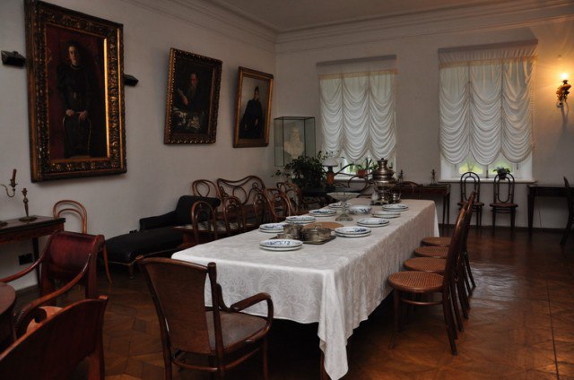 В центре зала – большой обеденный стол, во главе которого всегда сидела Софья Андреевна, а Лев Николаевич – по правую руку от нее. В углу у окна стоит стол из красного дерева, который называли “уголок серьезных бесед”. За ним Лев Толстой либо читал с детьми, либо беседовал с гостями. На стенах зала расположены портреты членов семьи. Главное место занимает портрет Льва Николаевича, который написал Иван Крамской. История его создания необычная – Павел Третьяков давно хотел получить в свою галерею портрет великого писателя и поэтому заказал его создать, но Толстой долгое время отказывался позировать. Тогда Крамской сам приехал в Ясную Поляну и после долгой беседы с писателем ему удалось получить согласие, но при одном условии – художник должен был написать портрет и создать его копию: оригинал оставить в доме Ясной Поляны, а копию передать в галерею Третьякова. В течение месяца, пока Толстой работал над романом “Анна Каренина”, Иван Крамской писал оба полотна одновременно. Поэтому в Ясной Поляне и в Третьяковской галерее находятся одинаковые портреты и оба из них – оригиналы.