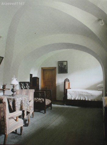 Далее следует комната с низкими сводчатыми потолками, которая находится на первом этаже. Во времена Николая Волконского здесь была кладовая – на стенах до сих пор видны крюки, на которые вешались запасы еды. В этой тихой и прохладной комнате Толстой особенно любил работать. Здесь родился замысел “Войны и мира”. Здесь же, в 1906 году, на руках у отца умерла от воспаления легких его любимая дочь Мария. А в ночь ухода Толстого сюда постучался Лев Николаевич к младшей дочери Александре, чтобы попросить помочь собрать вещи.