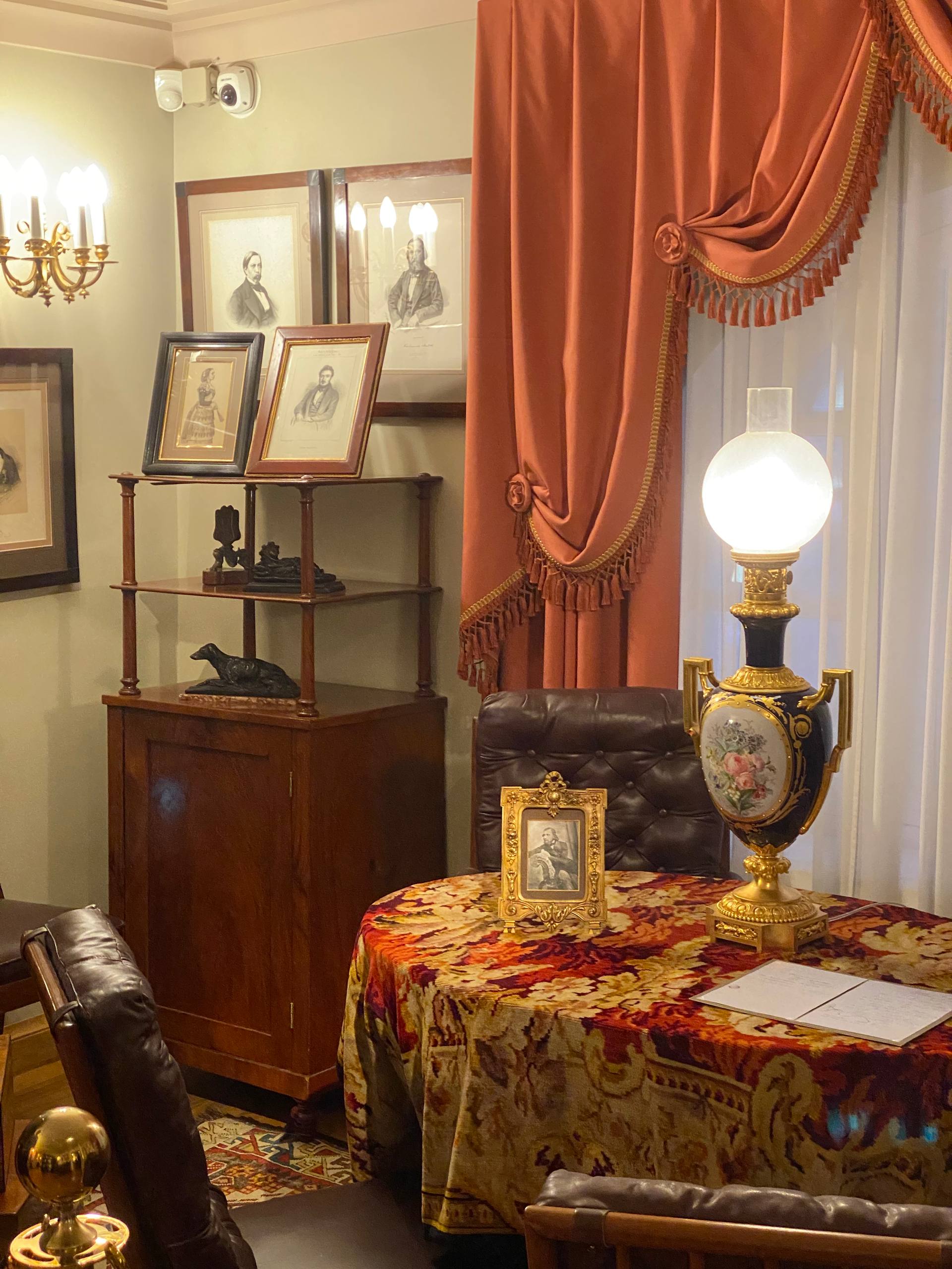 Из лакейской дверь ведет в официантскую комнату, где сервировали блюда для стола. Здесь расставлены буфет с посудой, самовар, английский чайник, а также висят картины с изображениями европейских городов, в которых бывал Иван Сергеевич. Он так много путешествовал, что даже Федор Достоевский называл его “русским скитальцем” и “русским европейцем”. Тургеневу тяжело было находиться на одном месте, он постоянно хотел куда-нибудь поехать и одновременно с этим тянулся к родным краям. Он нуждался в новых впечатлениях и при этом стремился к жизни в своем доме.